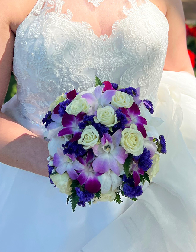 Perfect simple round Hawaiian wedding bouquet made primarily with fresh orchids – white, green, purple or “pink” which looks more like a light lavender. Scroll through the images to view the 4 orchid color choices. Any other color choice besides white, green, purple or “pink” will be accomplished with other flower varieties, like roses, carnations, wild flowers, etc., and please keep in mind that if you choose blue, we will color dye an orchid to accomplish blue.