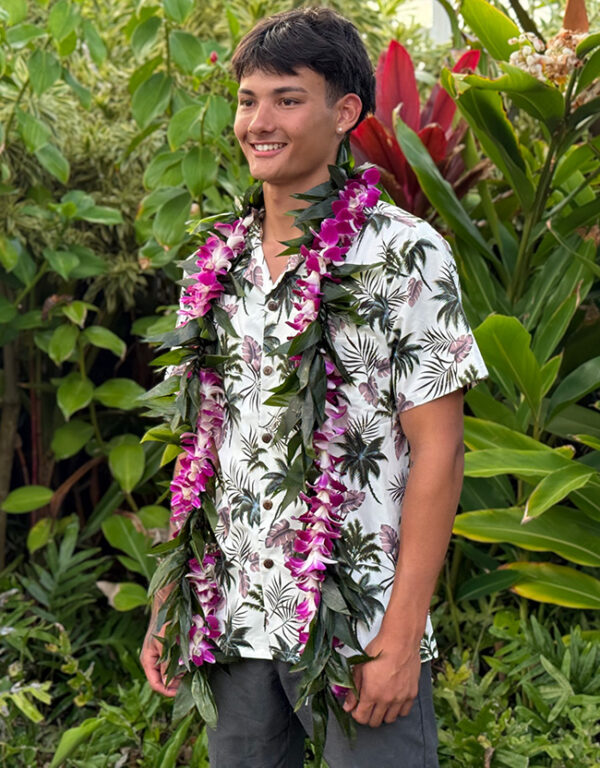 Longer and fuller than our regular Ti Leaf and Orchid Lei, this Double Maile Style lei is absolutely stunning wrapped with a fresh strand of our classic purple orchids. Makes a gorgeous celebratory lei and looks great draped down a graduation gown!