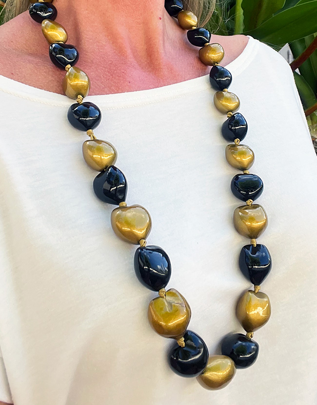 Kukui nuts are sanded, polished, and painted gold and combined with natural black kukui nuts in this Kukui Nut Lei made to celebrate your black and gold team or school colors.