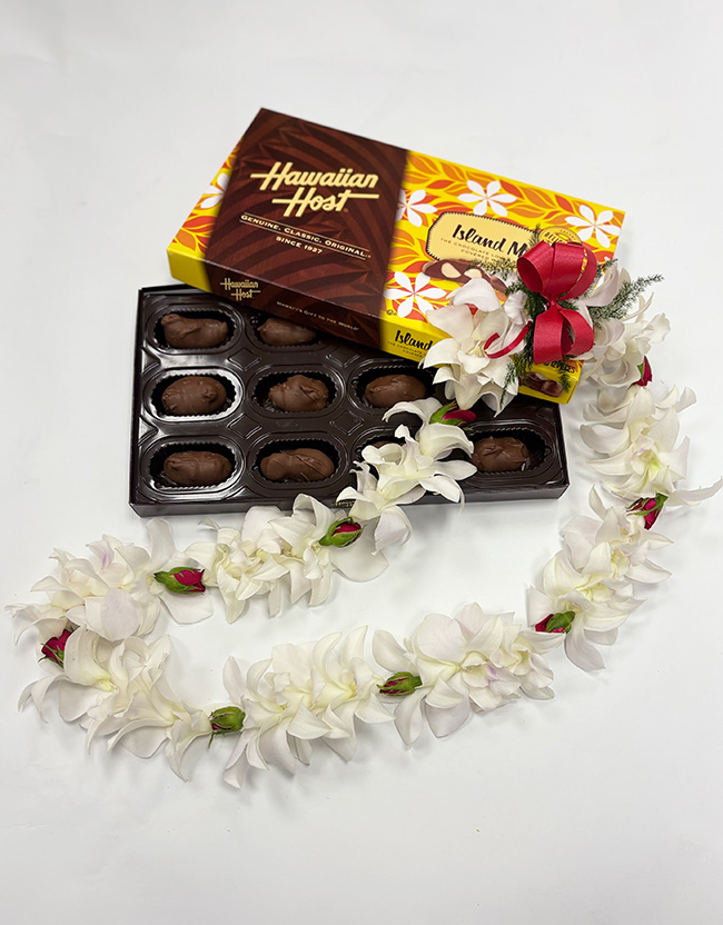 Embrace the one you love with a fresh White Orchid & Rose Lei and delicious Chocolate Covered Macadamia Nuts.